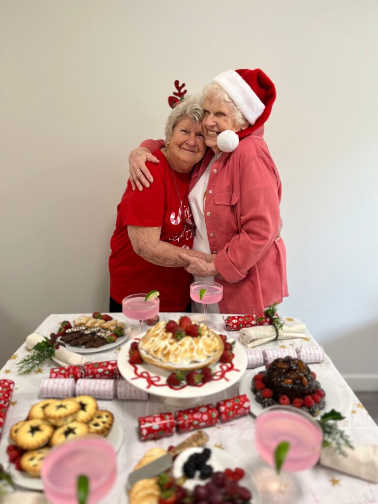 CHRISSY CUDDLES: Seasons Living residents (from left) Lorraine and Edna wishing each other a Merry Christmas, before tucking into lunch. Picture: Maddison Bywater